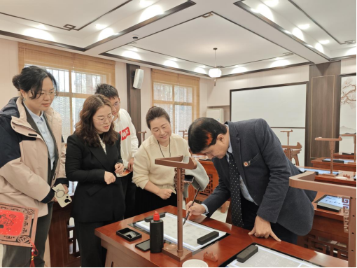 代表团先后走进学院心理健康教育中心、书法教室、师韵堂等场所,实地了解学院办学建设情况。在心理健康教育中心,详细了解中心建设运营模式;在书法教室,体验毛笔书写,沉浸式感受中华汉字文化魅力;在学院中庭,深入了解我院师范教育改革实践。