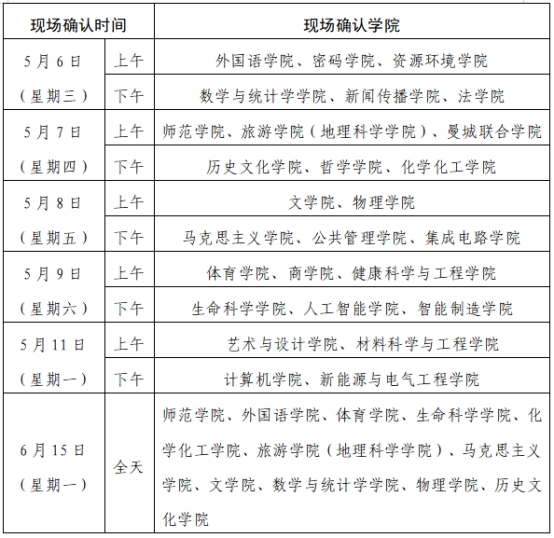 4.各学院现场确认时间安排见下表,如有变动另行通知。